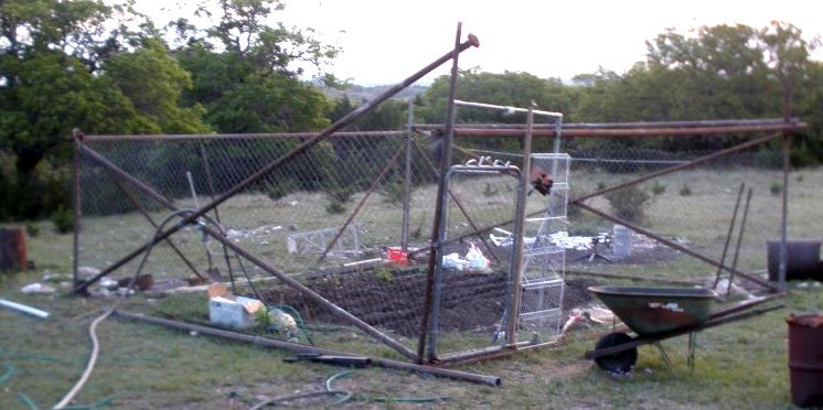 I’m a lucky man because I don’t have the money to go buy ready-rolls when it comes to getting done what needs doing. In this instance I needed a garden, but I didn’t want 86 deer, 23 wild hogs and a dozen chickens in there being Communists 24/7 messing up my diggings. But I also din’t want to have to be digging holes to support any fence I wanted to put the trouble into erecting. The layered limestone wasn’t in a mood to give up any ground in favor of having posts stuck in it.