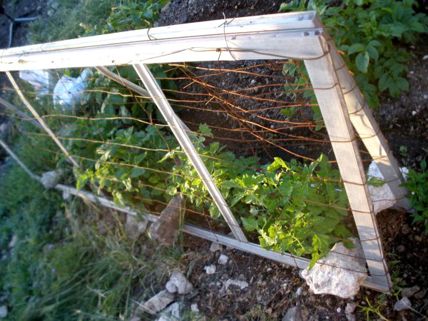 The ‘frame’ includes two welded steel triangles used to support something long forgotten, a bit of galvanized discarded water pipe, and that’s about all besides one hell of a lot of tie-wire. Ah. There’s that gate frame gives it some support on this end. But it’s strong, self-supporting and didn’t need any violations of the sanctity of the limestone substrata to allow it to become respectable.