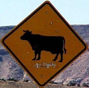 When you’re driving along and you see this sign it means you are in a free-ranging area and that the man running cows without having to fence them off the public right-of-way will get a prize-breeding-stock price for his beef from your insurance company if he can arrange a way for you to run one over.