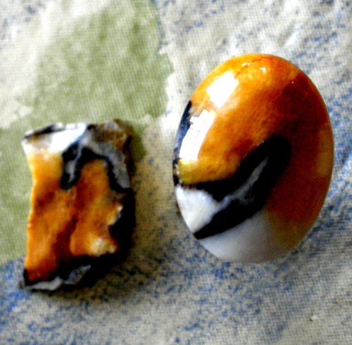 He’d just finished cutting this piece and it was a bit oily from the saw. It’s going to be a beautiful chunk of rock when it’s polished. Beneath it’s another recent acquisition, zebra agate, formed from river delta bottom mud. The paisley’s caused by the shells of marine life. He hasn’t slabbed and polished any of it yet.