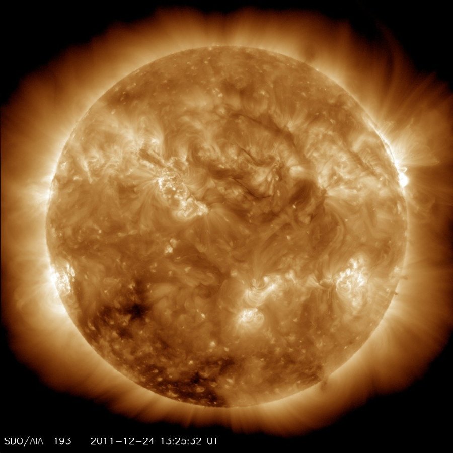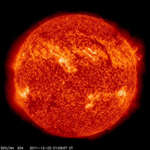 The C5-class eruption hurled a billion-ton coronal mass ejection (CME) into space, but not toward Earth. With the cloud sailing wide-left of our planet, Christmas geomagnetic storms are unlikely. Nevertheless, this active region merits watching as it turns toward Earth in the days ahead, possibly positioning itself for the first storms of 2012.