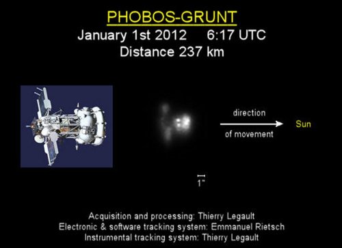 DOOMED MARS PROBE PHOTOGRAPHED: Russia’s Mars probe, Phobos-Grunt, has been stranded in Earth orbit since a main engine failure in early November. The spacecraft is now sinking back into Earth’s atmosphere, with re-entry expected in mid-January. “On New Year’s Day, I traveled to the French Riviera (850km from home) to record Phobos-Grunt’s last passage over France,” says astrophotographer Thierry Legault. This is the picture he took through a 14-inch telescope.