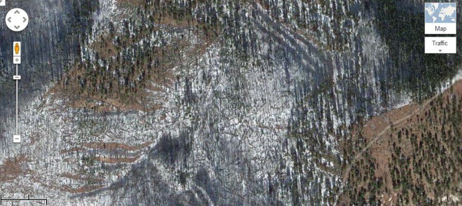 What you are seeing in that Google map is the Lost Adams Diggings. The line wandering along the lower right corner is the continental divide. The areas with snow on the surface are shaded part of the day so’s not to have melted yet, the dark areas are lower, now in shadow. The tiny short lines all over the place are deadfall left by a forest fire that swept the area in the 1990s.