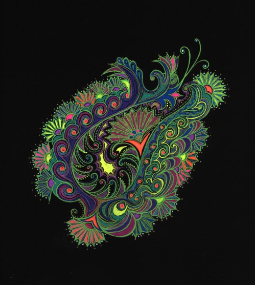 I’ve noted before that they seem partial to some 3-D element for the prize winners, but I haven’t tried that yet.  There are a lot of ways that could be done with my work, but without my work by nature being 3-D,  I suspect it would look contrived. I also get frustrated when I get too far away from the actual drawing (like those pendants, where the glass cutting and soldering is time-consuming).  Cutting paper, layering paper, rotating layers of paper, mirror-edges around the design–all of them  sound cool but don’t really sound fun to put together.  I’m really not a paper-crafter.