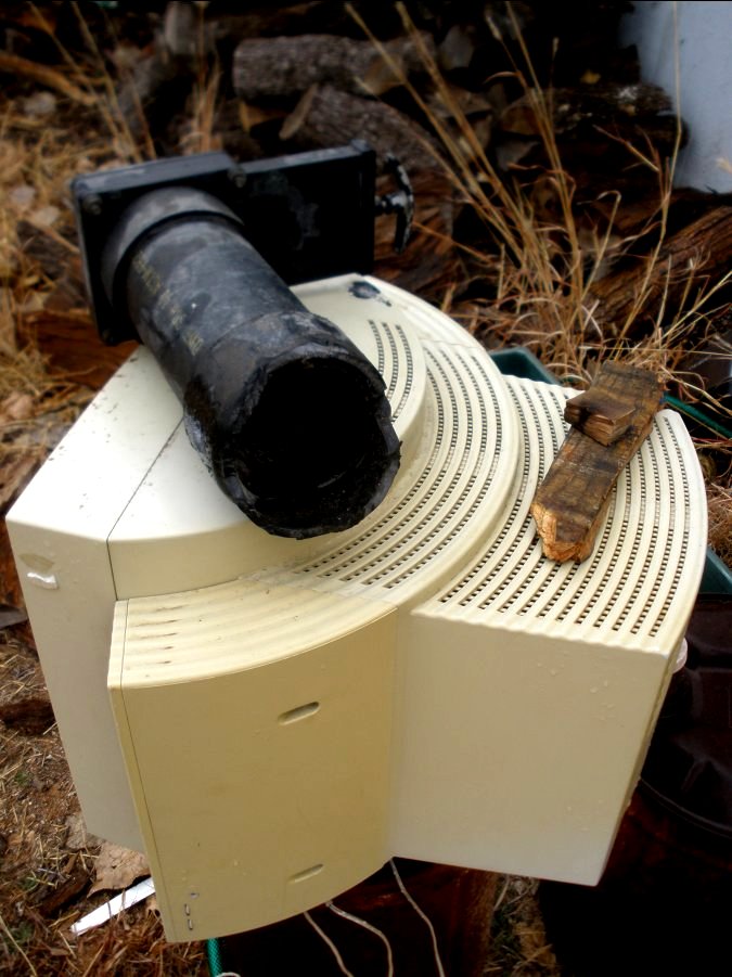 Eddie did some web searches to find out what products might be made of ABS to be ravaged for the purposes of converting them to RV wastewater heaven. One turned out to be old computer monitors.  So he dug around until he found one.