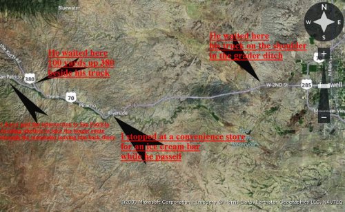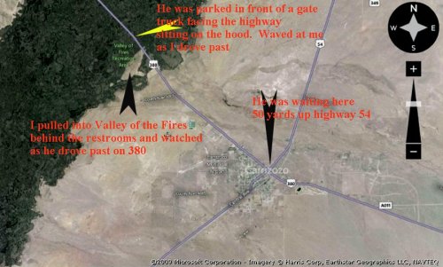 I was convinced by the time I passed him on the hood of his truck west of Valley of the Fires that he was a cop… couldn’t see any way a private citizen could have the equipment it would take to do what he was doing.