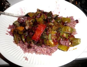 Anyway, I was leading up to saying I made up the most toothsome stir-fry curry dish without any salt at all last night, with steamed rice. Gave Jeanne a taste before dumping it onto the rice. A look of delight crossed her face briefly before she gasped, “Wow!” and ran for something to drink.