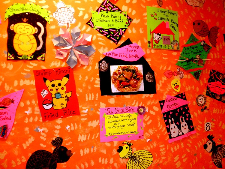 The pink haired, much pierced daughter of the Hong Kongish couple owning the Iron Horse [low sodium] Asian restaurant spent a year or more doing the menu-items on the walls and ceiling. Prices don’t change much and aren’t likely to, I’m thinking.