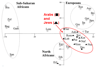 The Times recently carried this unusual report on an Israeli Jew (Tsvi Misinai, a retired computer expert) who’s hoping to prove that Palestinians are descended from Jews. Apparently, he thinks that proving this will help to stop the bloodshed. His idea is that modern Jews are descended from emigration in the first few centuries of the Christian era. The Jews who stayed put in Palestine converted to Islam, and became Palestinian Arabs. There’s hope that genetic tests might be able to prove this.Well, there is good news and bad news on that score.The good news is that the genetics of Arabs and Jews have been pretty extensively researched. The classic study dates to 2000, from a team lead by Michael Hammer of University of Arizona. They looked at Y-chromosome haplotypes – this is the genetic material passed from father to son down the generations.