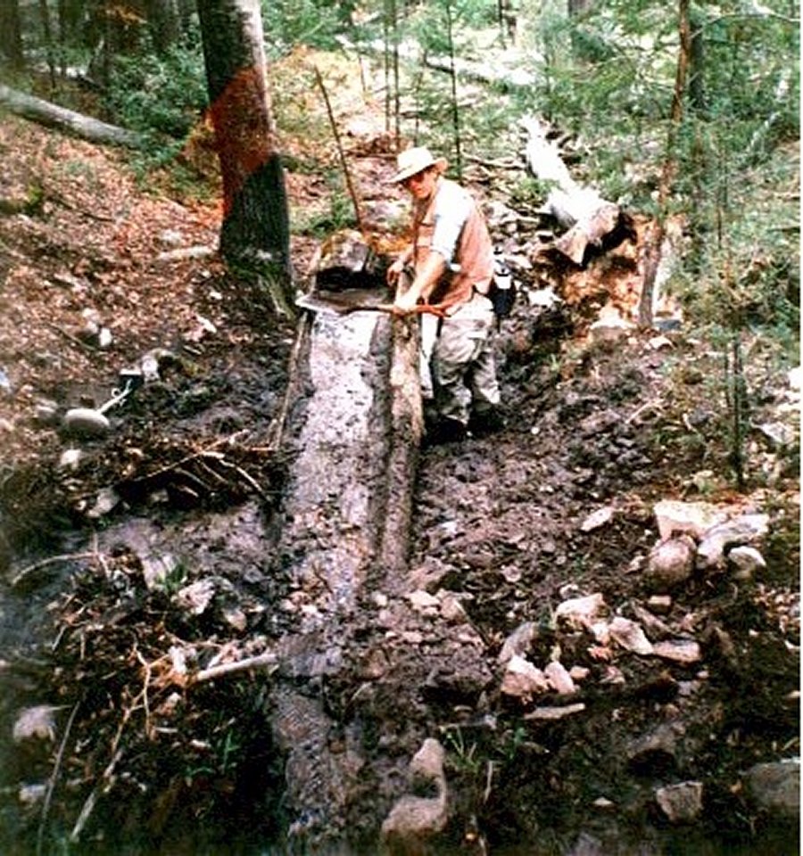 A longtom sluicebox axed out of a 3 foot diameter log, a spring 75 feet above the sluice, an arrastra below. I’d been walking past the arrastra a few years before I recognized it for what it was. One day I was leaning against a deadfall aspen getting my breath, gazing at it, when it dawned on me that 500 pound rock had a reason for being shaped the way it was.