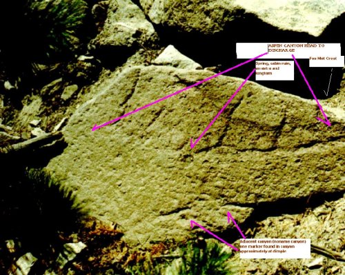 A mysterious map chiseled on the face of a 300 pound rock surface depicting the exact layout of the canyon, the cabin, the waterfall, all so accurately depicted the person had to have scrutinized the layout from the mountaintop, then scratched it on this stone 600 vertical feet below and half a mile away.